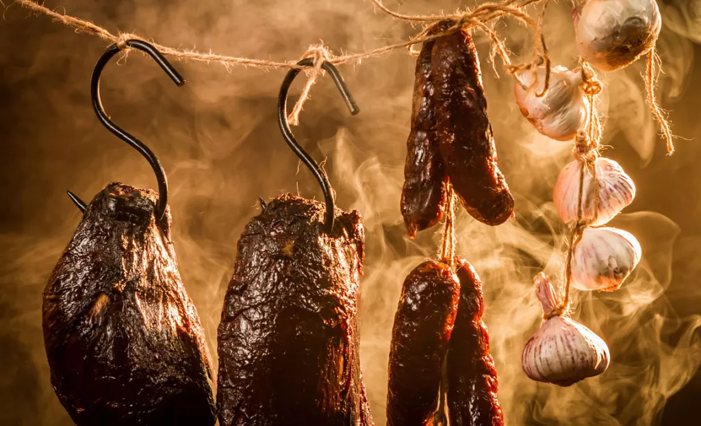 5. Chorizo: Jest to hiszpańska kiełbasa o charakterystycznym czerwonym kolorze, wędzona z pikantnymi przyprawami, takimi jak papryka i czosnek.